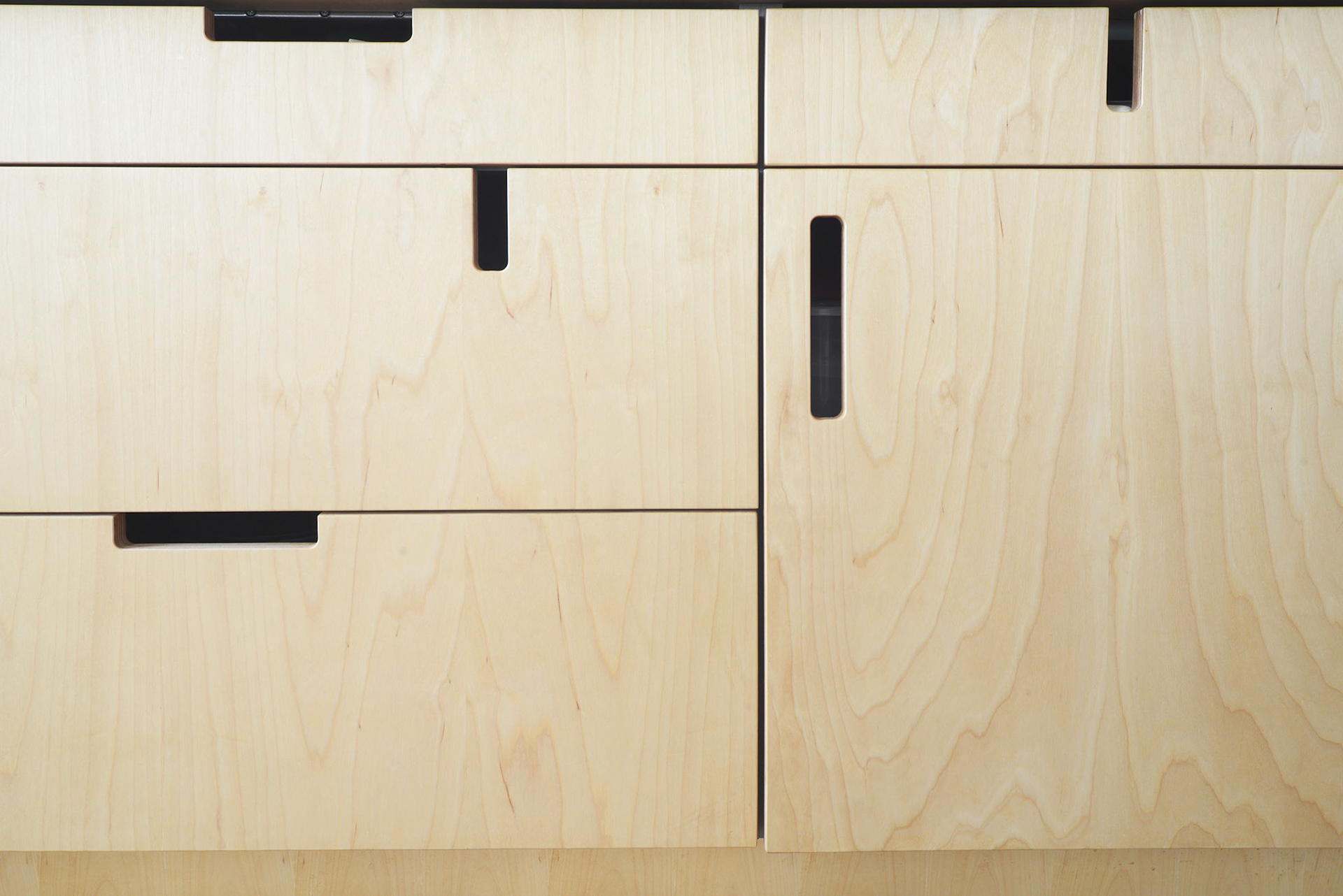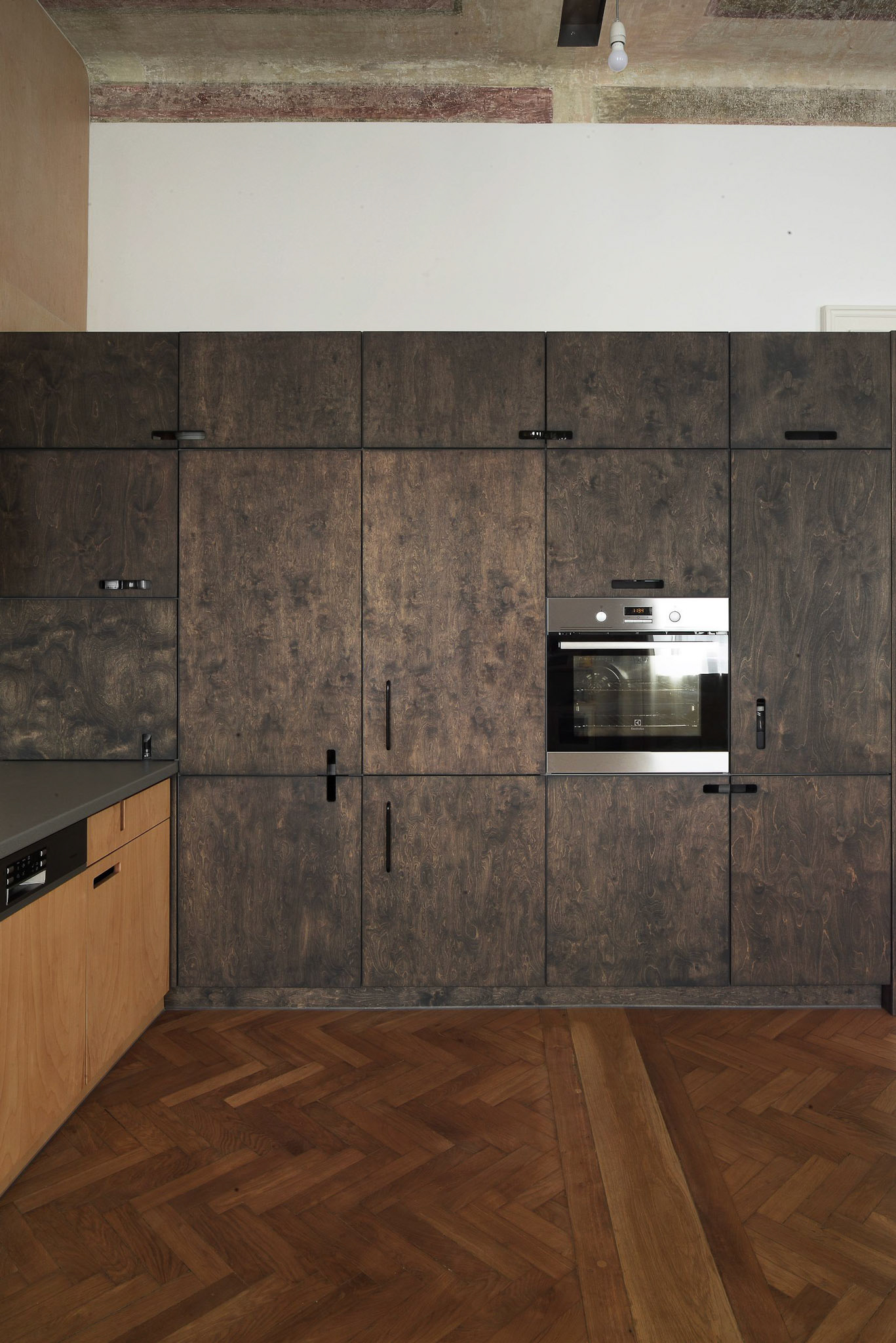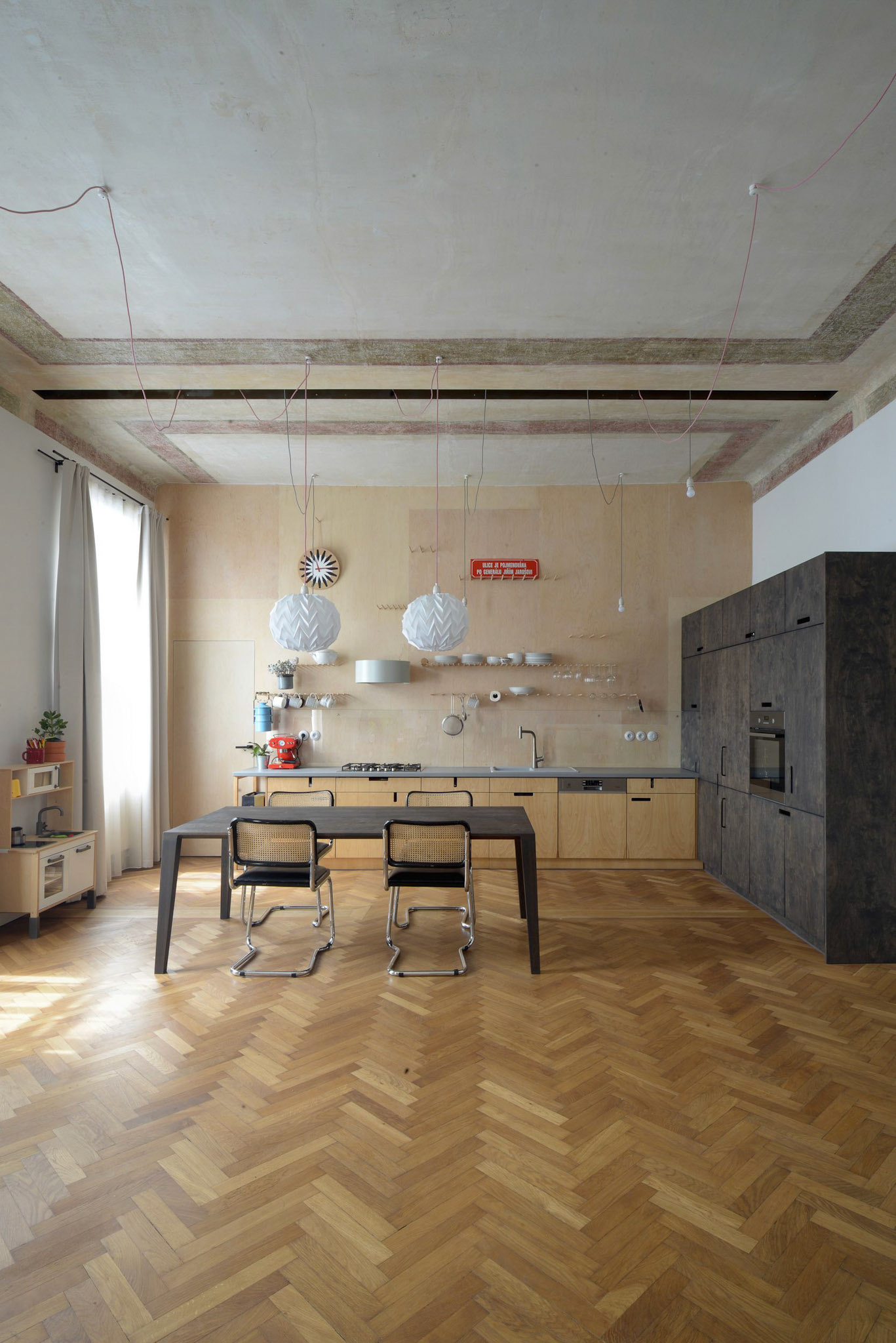 The flat has a typical interior layout for its time, the rooms are arranged one after another in line, with doorways in the centre of shared walls, which is not fully practical for today´s way of living but thanks to this enfilade this layout brings in a strong impression of space. That is why we have not practically interfered into this layout as we do not wish to supress this space of power. We have only shifted one wall and built a new one. The new walls are light, of a wooden construction panelled with plywood sheets. They are easy to be recognized from the rest. Our job has been to a great extent one of monument preservation – we have discovered original room decorations, we have reconstructed original doors and floors. The basic framework had already been achieved, we have only added the new built-in kitchen and bathrooms. Perhaps the most interesting room is the triangle hallway, a crossing of a few communications. Here we are creating an ornament using hexagon cement tiles.