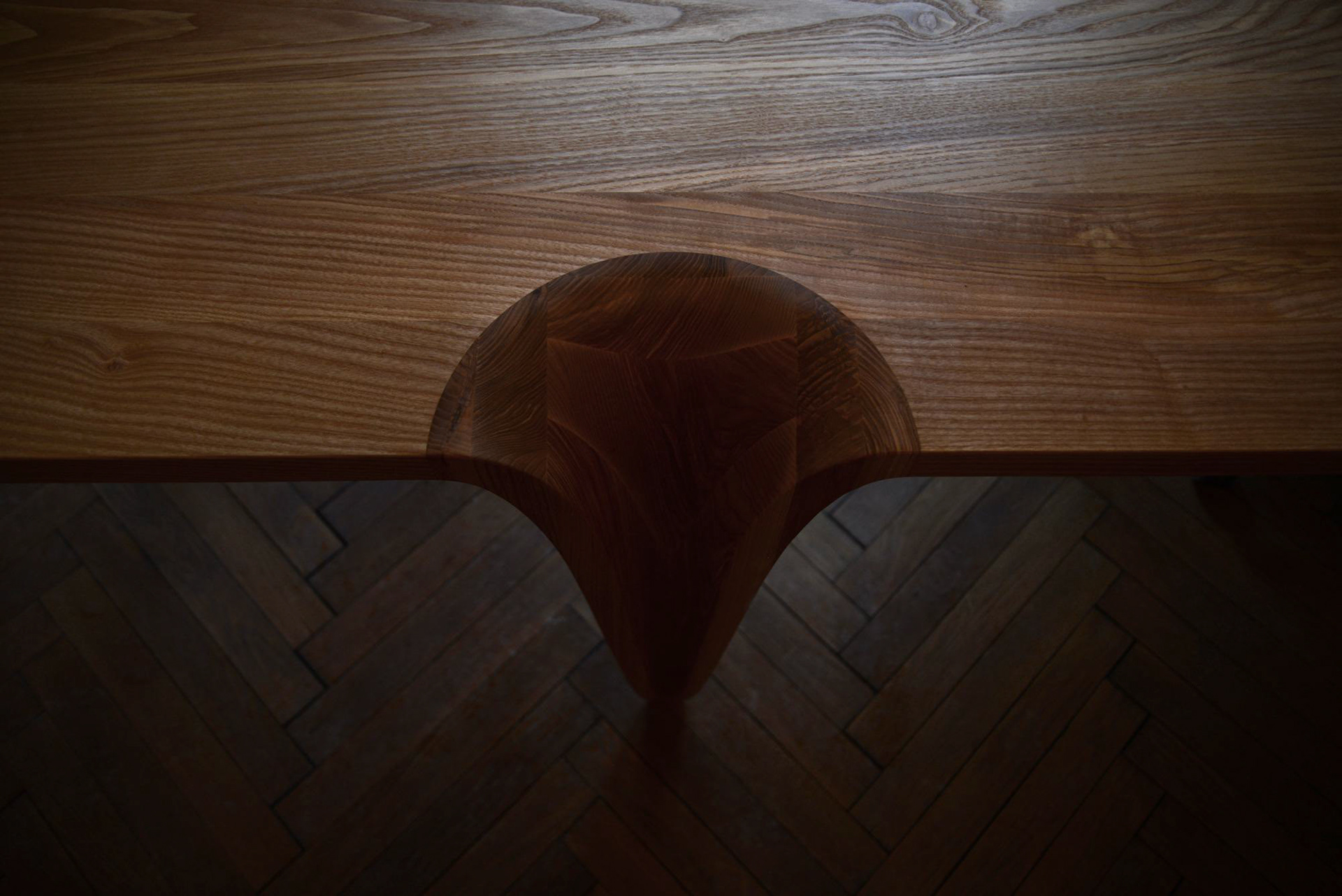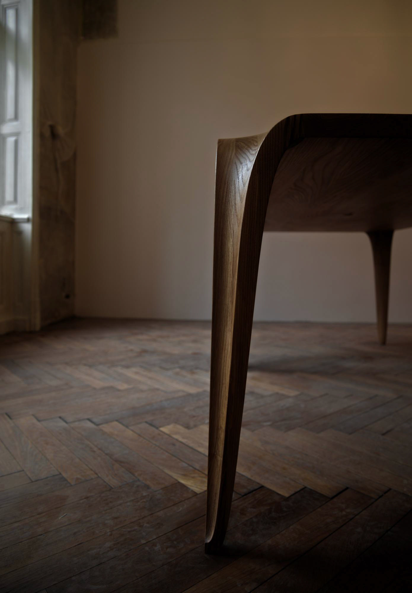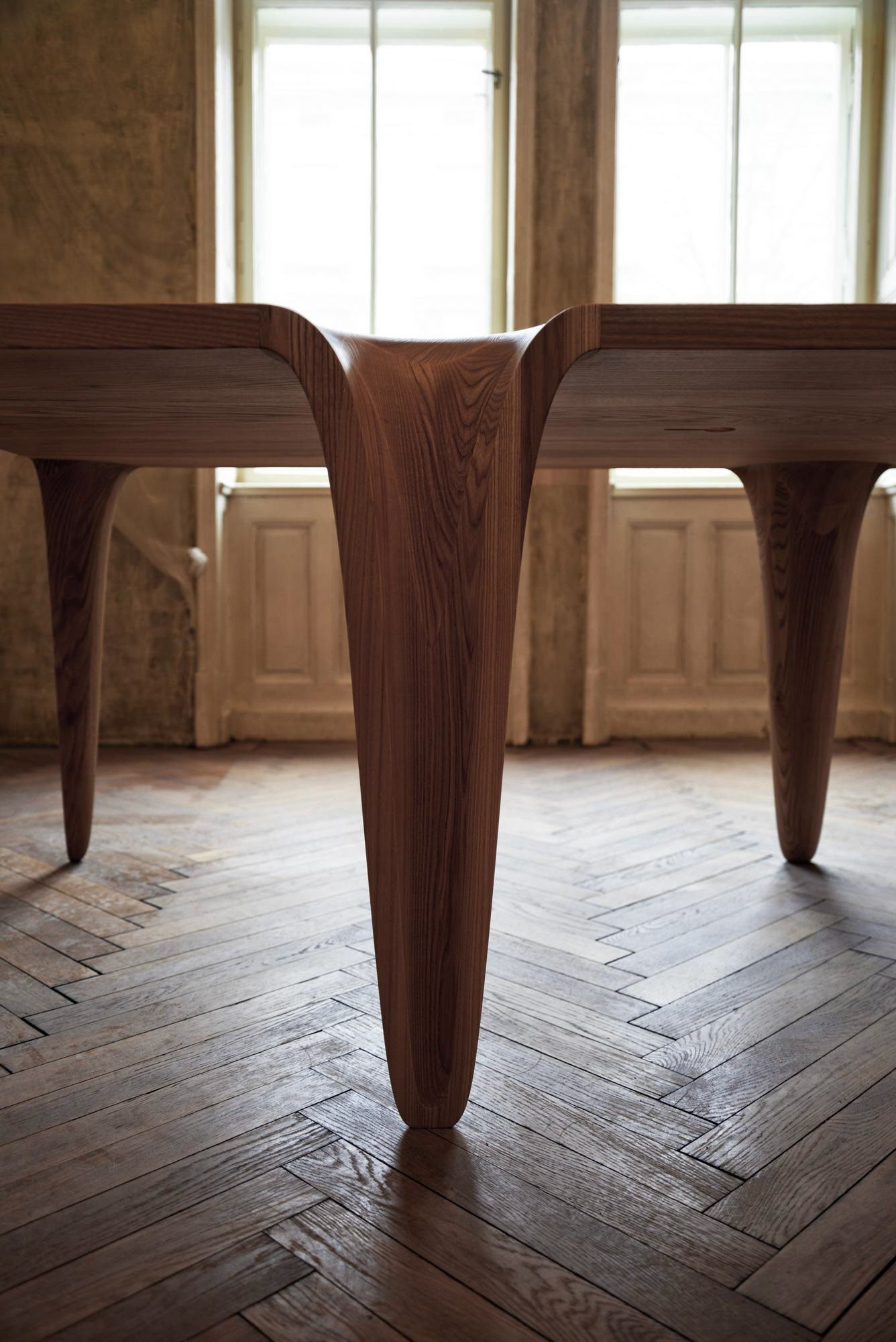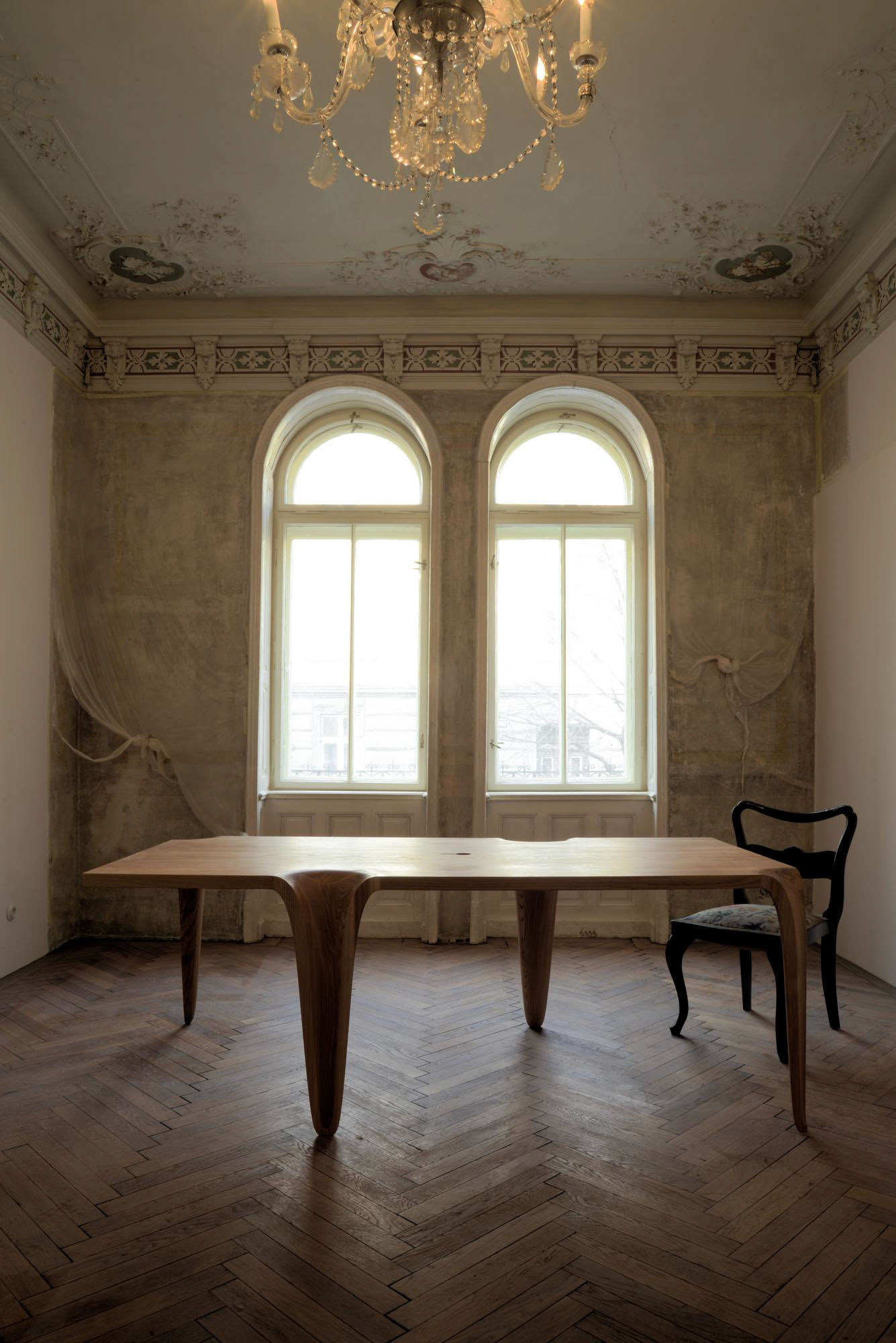 Navrhujeme stůl do velkolepého prostoru. Stůl, u kterého se pracuje, stůl pro jednání, stůl pro slavnostní oběd. Stůl si hrdě vykračuje pokojem, je středobodem prostoru. A my si na něj chceme sáhnout.