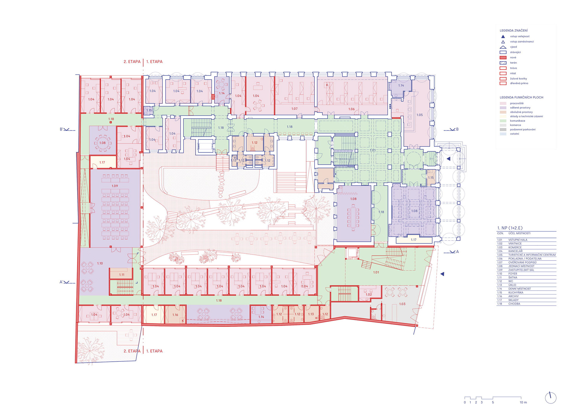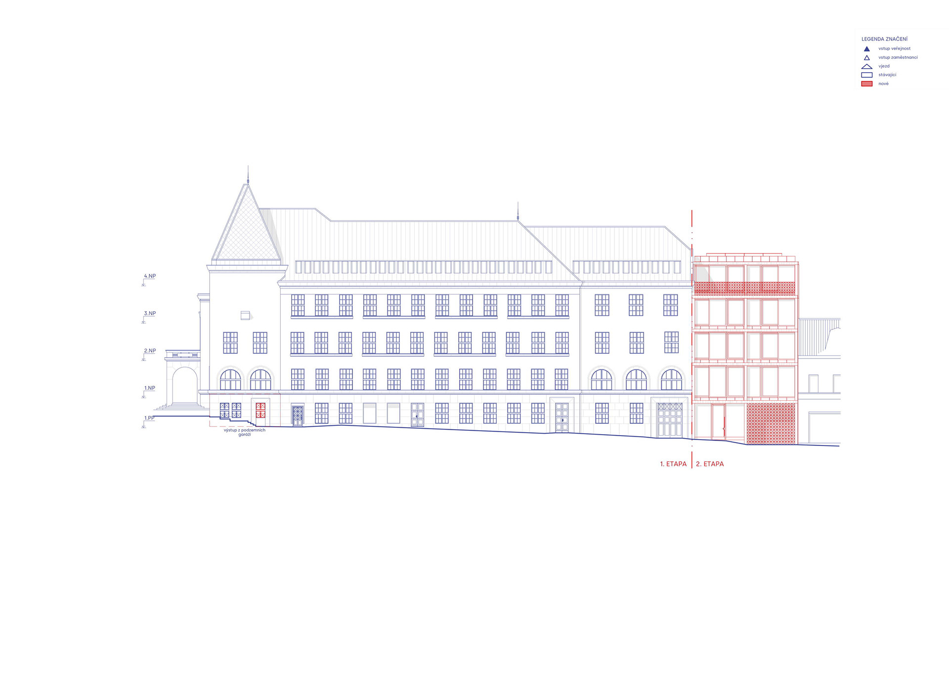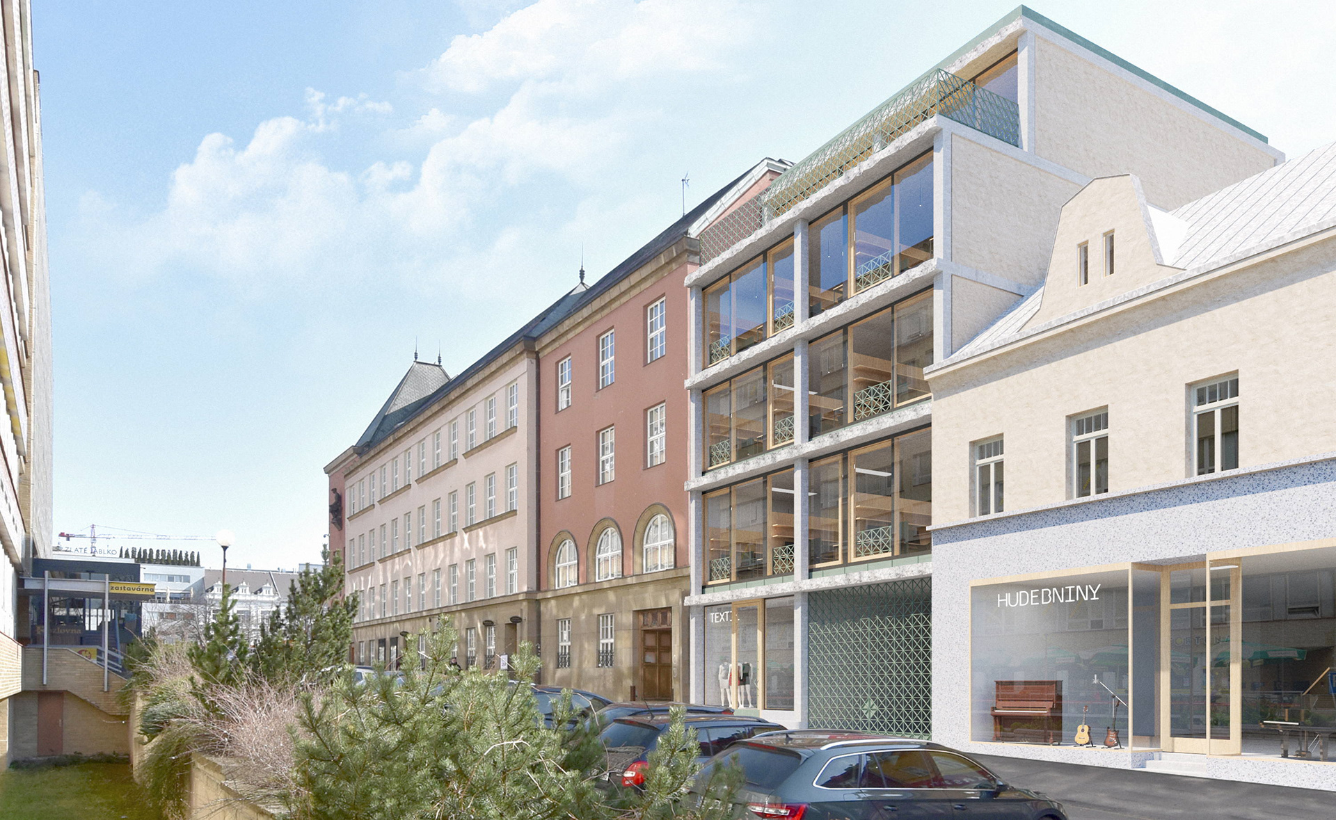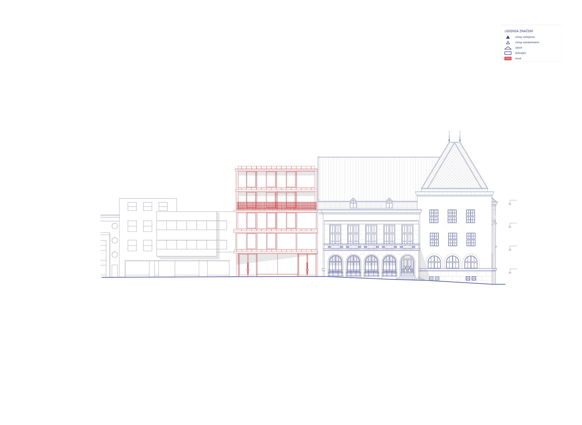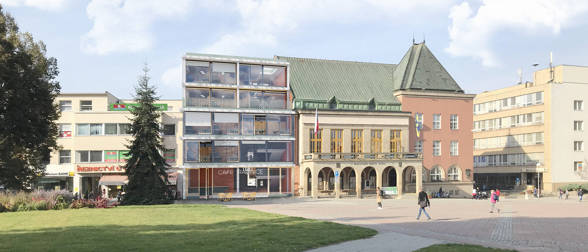 our design tries to make the most of them. The courtyard has a clearly defined shape, located in the embrace of the town hall buildings. Gahura is turning to yard by several newly created openings, the new building is then completely transparent. The garden is a place for organizing thoughts, peace and rest. A space of reconciliation between the official apparatus and the citizen applicant. It is also a civic forum where outdoor lectures and discussions can be held. A new bistro is proposed on the ground floor of No. 10 with the possibility of a terrace both on the square and in the courtyard. The additions do not compete with the Gahuras building but complement the building appropriately.