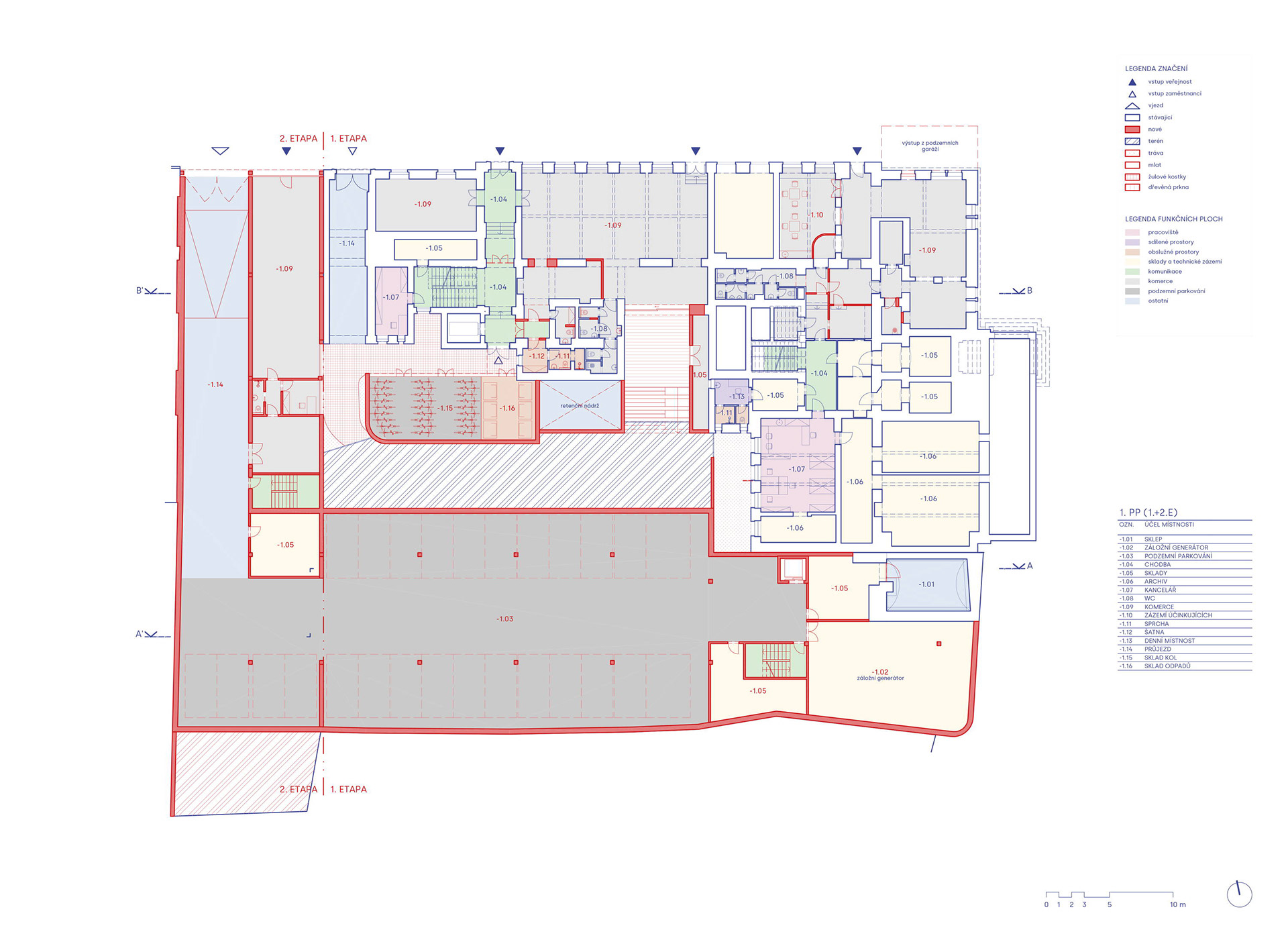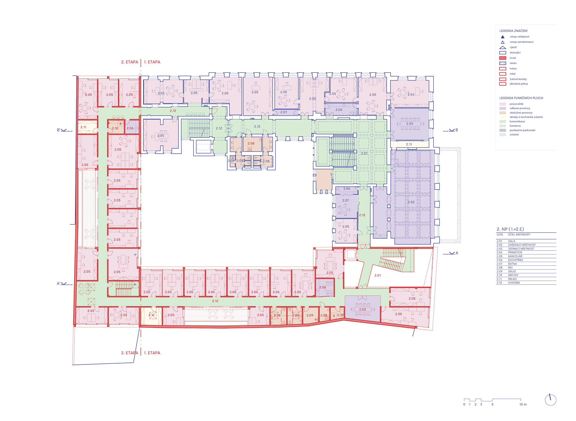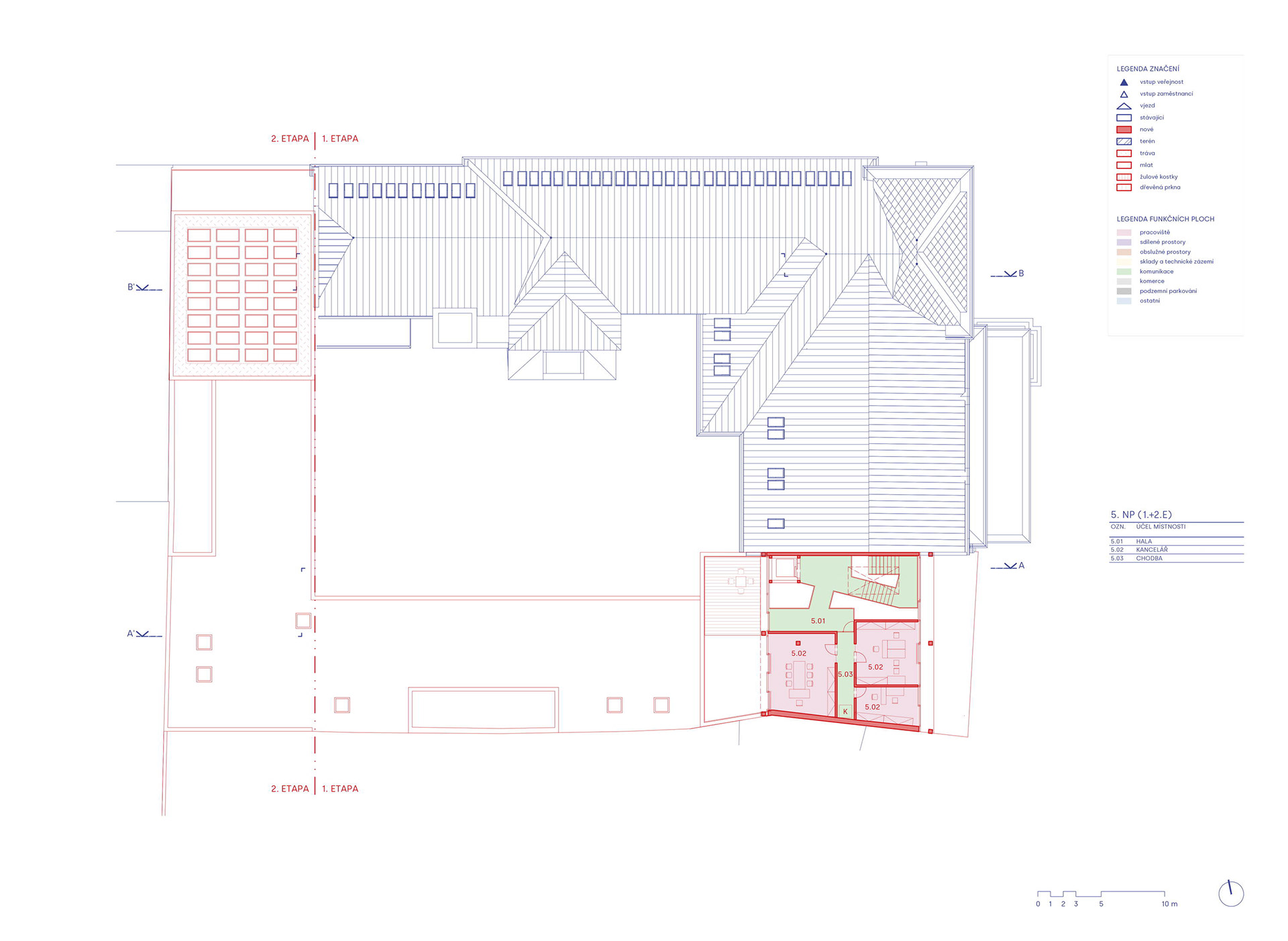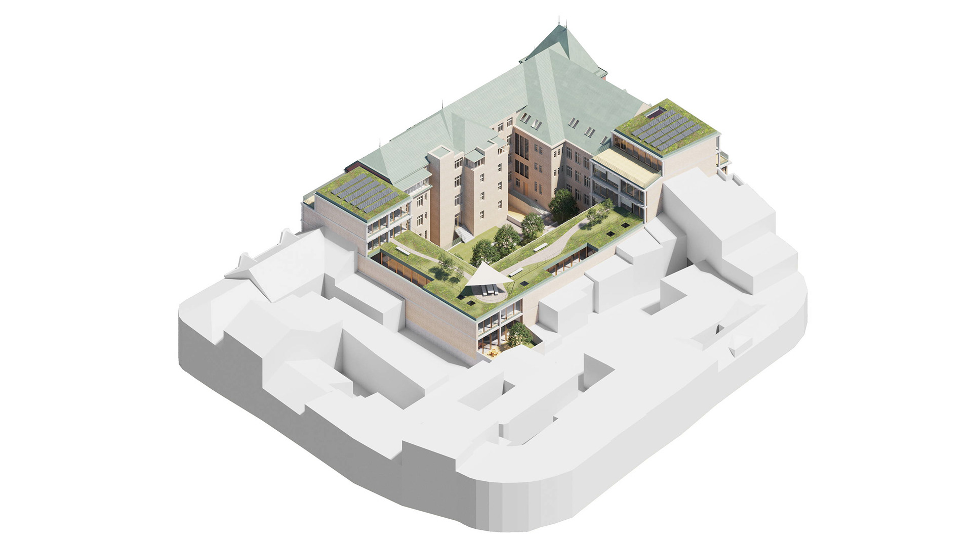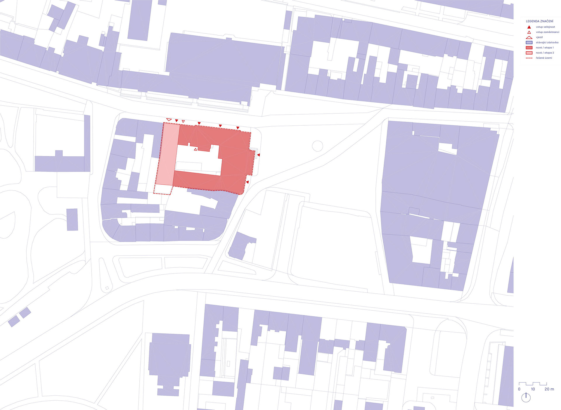 our design tries to make the most of them. The courtyard has a clearly defined shape, located in the embrace of the town hall buildings. Gahura is turning to yard by several newly created openings, the new building is then completely transparent. The garden is a place for organizing thoughts, peace and rest. A space of reconciliation between the official apparatus and the citizen applicant. It is also a civic forum where outdoor lectures and discussions can be held. A new bistro is proposed on the ground floor of No. 10 with the possibility of a terrace both on the square and in the courtyard. The additions do not compete with the Gahuras building but complement the building appropriately.