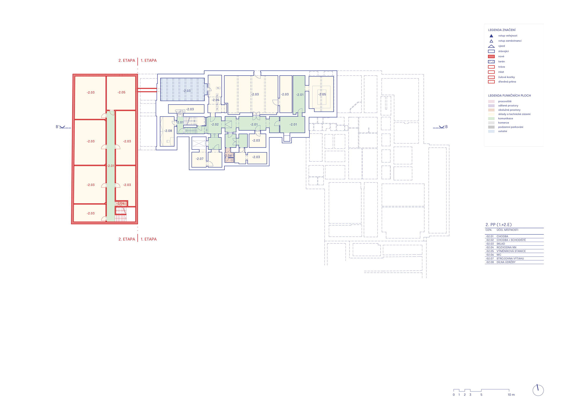 In the design we thematize the Zlín phenomenon - a concrete monolithic skeleton. The skeleton, which penetrates from the inside out, sets the scale for the house. Houses are not just abstract boxes. The floor slabs overhang in front of the columns, the overhangs themselves shielding, but at the same time covering the shading shutters. The pre-set structures are thermally separated. The rough finish of the slab overlaps is created in situ after concreting. The skeleton, which is presented from the outside, is not just a hanging tile, but the actual load-bearing structure of the house. All office units are naturally lit, separated by light partitions.
