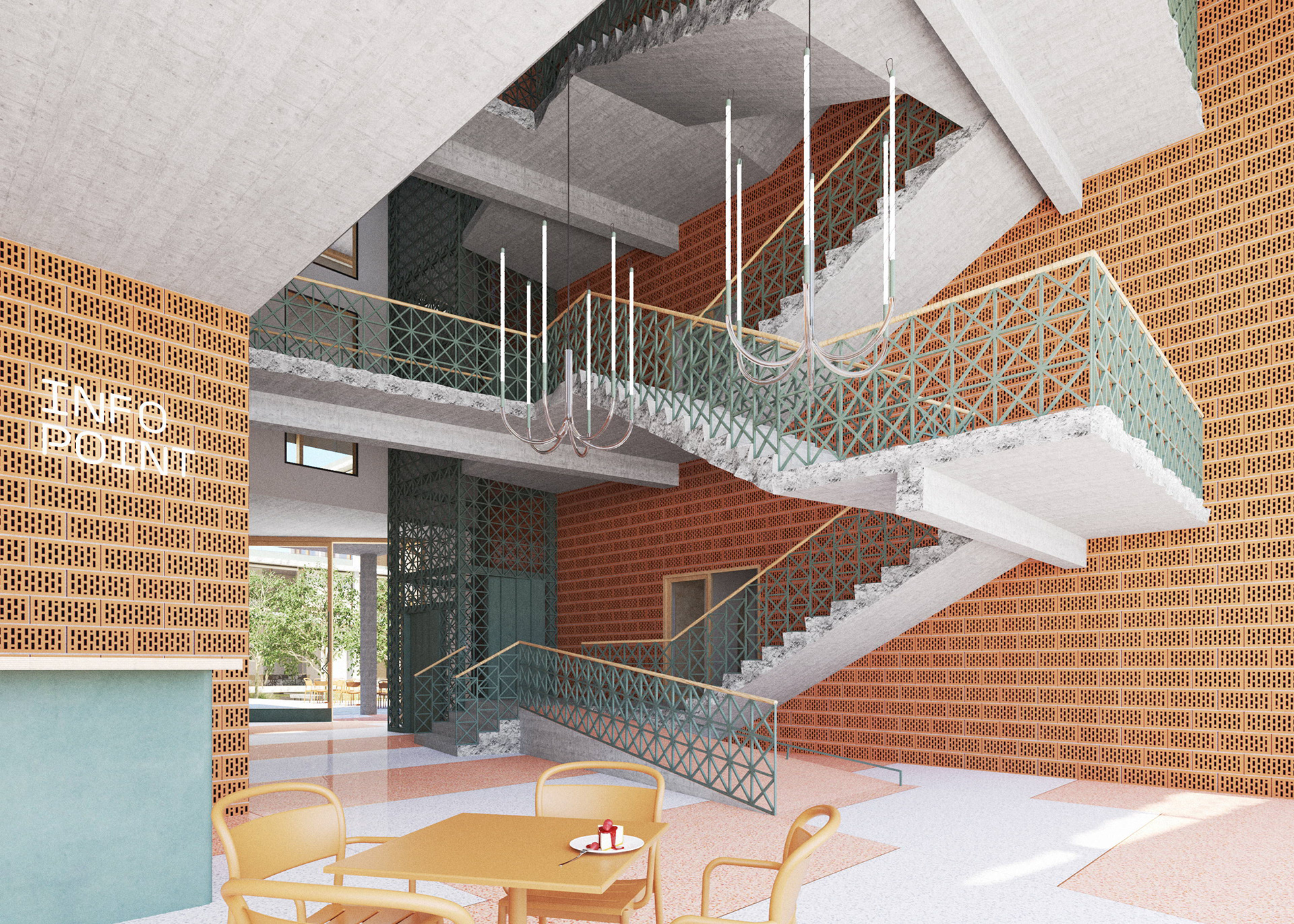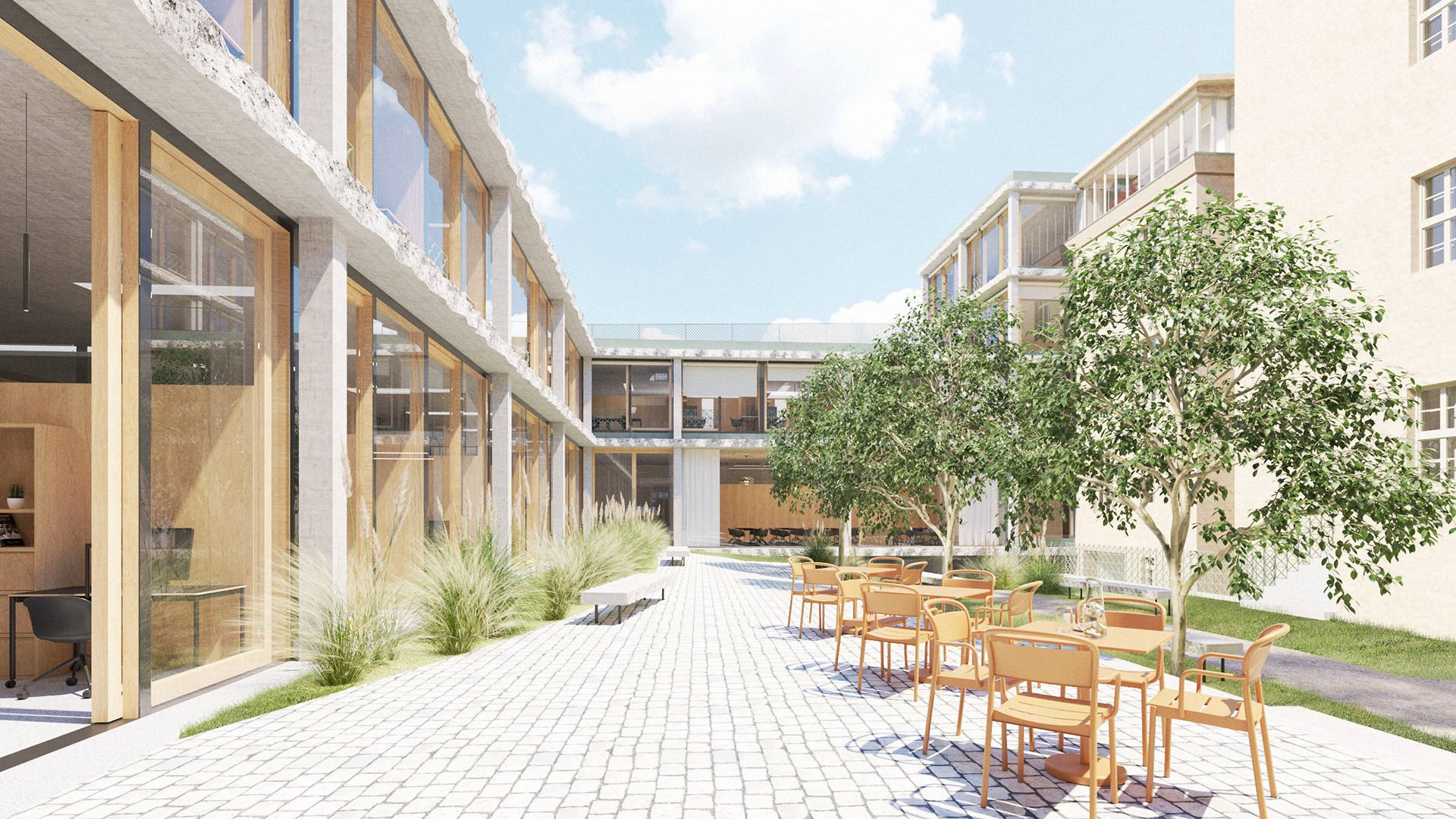 se náš návrh snaží maximálně využít. Dvůr má jasně vymezený tvar, nachází se v objetí budov radnice. Gahura se sem obrací několika nově vytvořenými otvory, novostavba je sem pak naprosto transparentní. Zahrada je místem pro uspořádání myšlenek, klidu a odpočinku. Prostor smíření úředního aparátu a občana žadatele. Je zároveň občanským fórem, kde je možné pořádat venkovní přednášky a diskuze. V přízemí č. p. 10 je navrženo nové bistro s možností terasy jak na náměstí, tak ve dvoře. Gahurově budově přístavby nekonkurují, ale vhodně stavbu doplňují. Do vnitrobloku záměrně nevkládáme