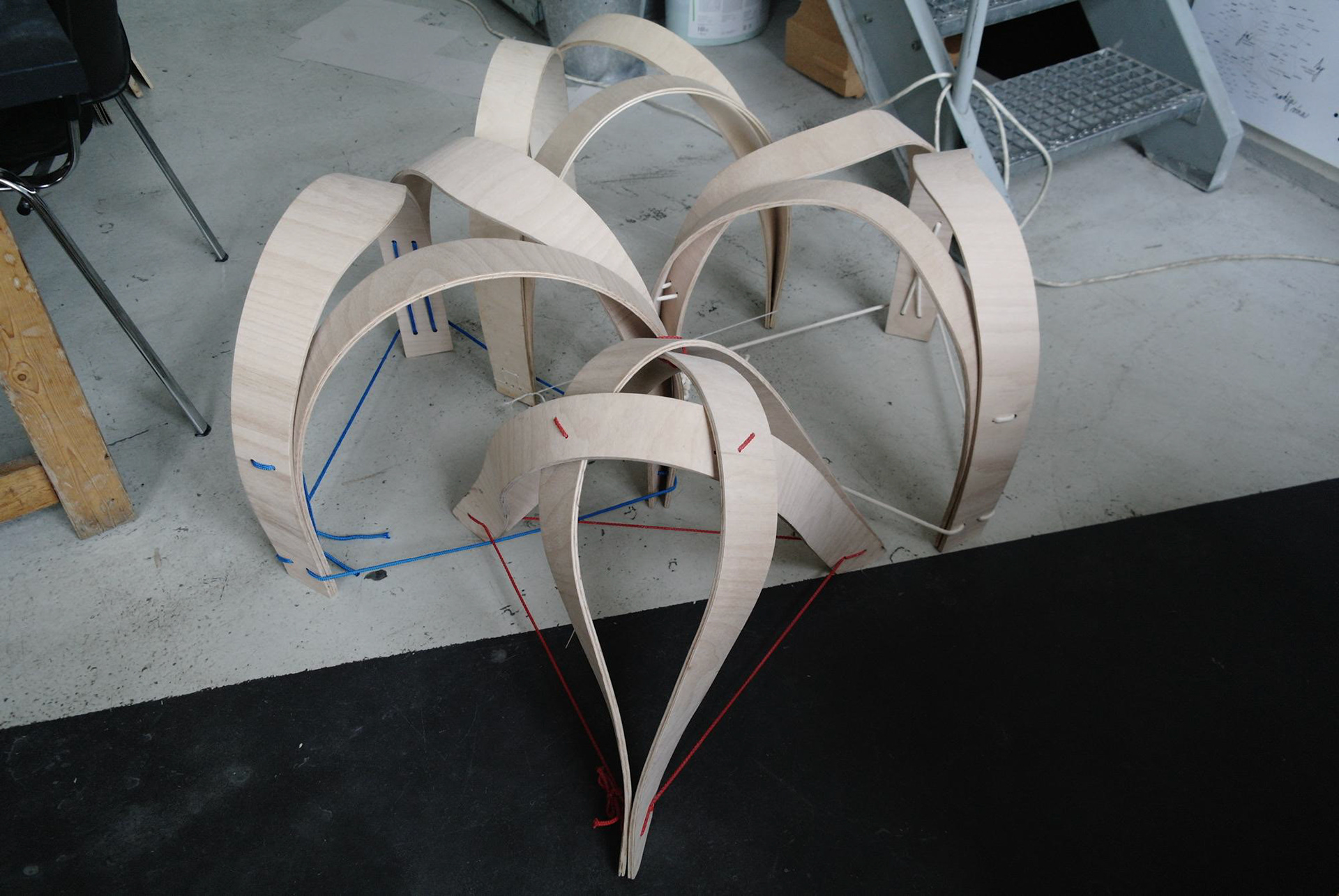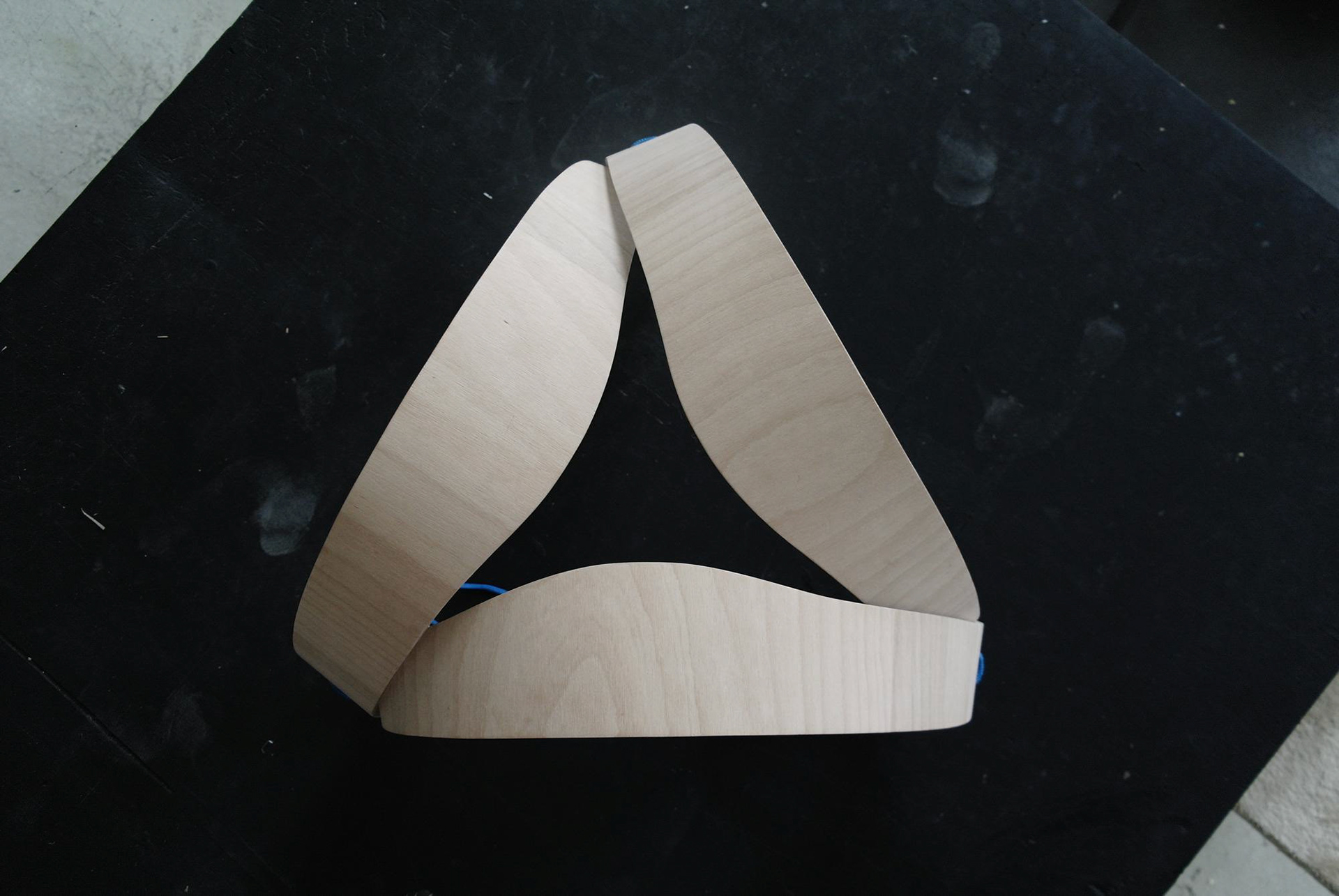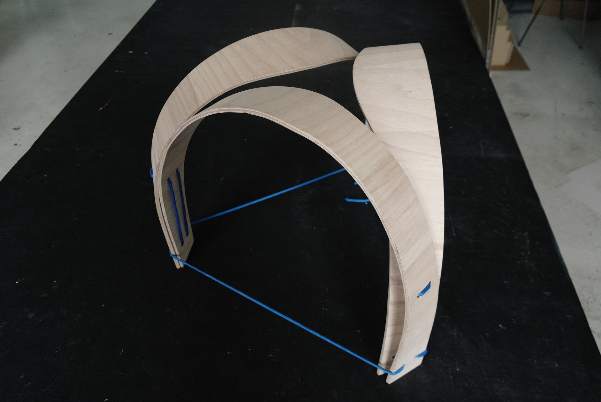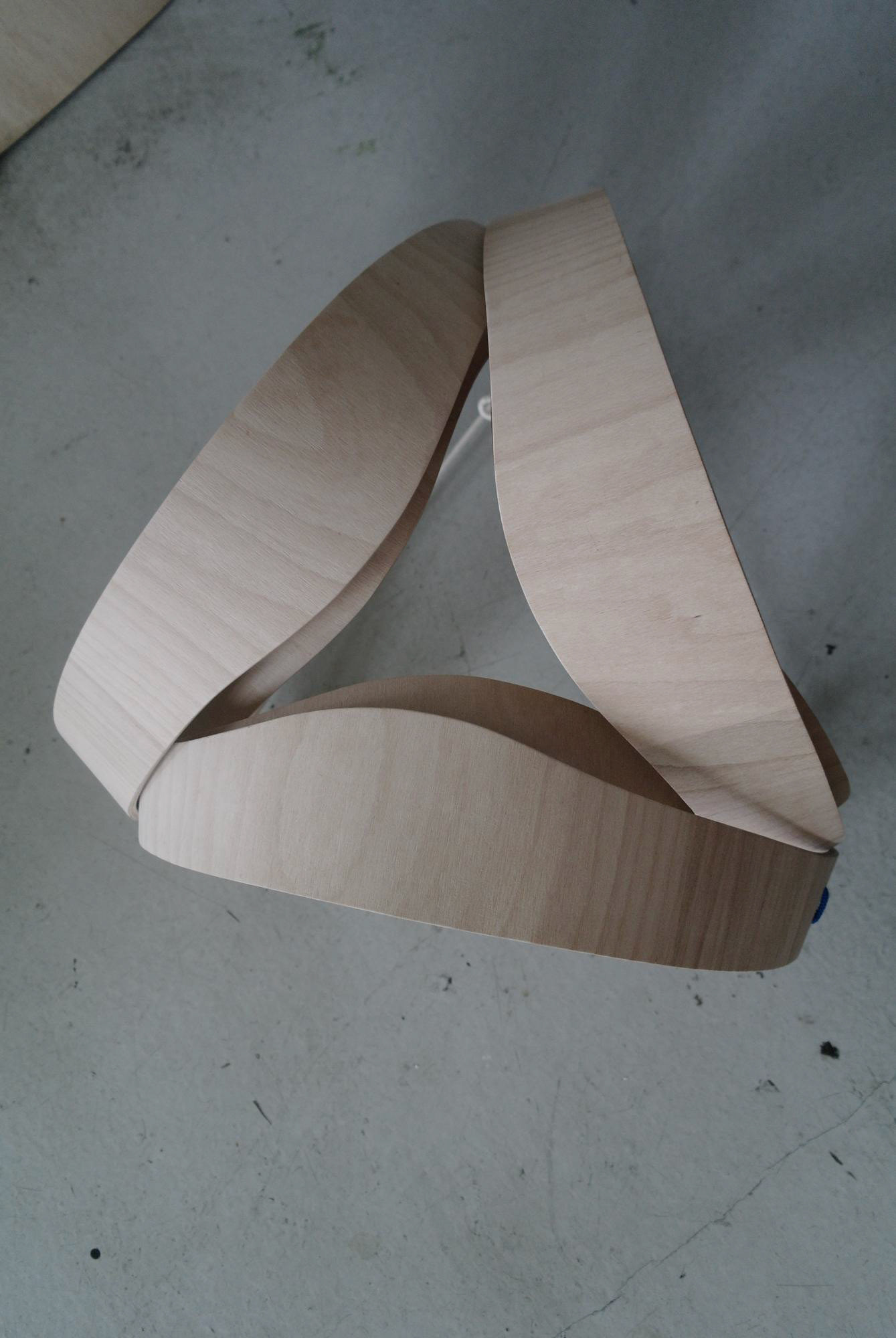 Tři lamely z bukové překližky, ohnuté, propletené a svázané lanem. Jednoduché gesto, vlastnoruční výroba. Přijďte posedět do atelieru.