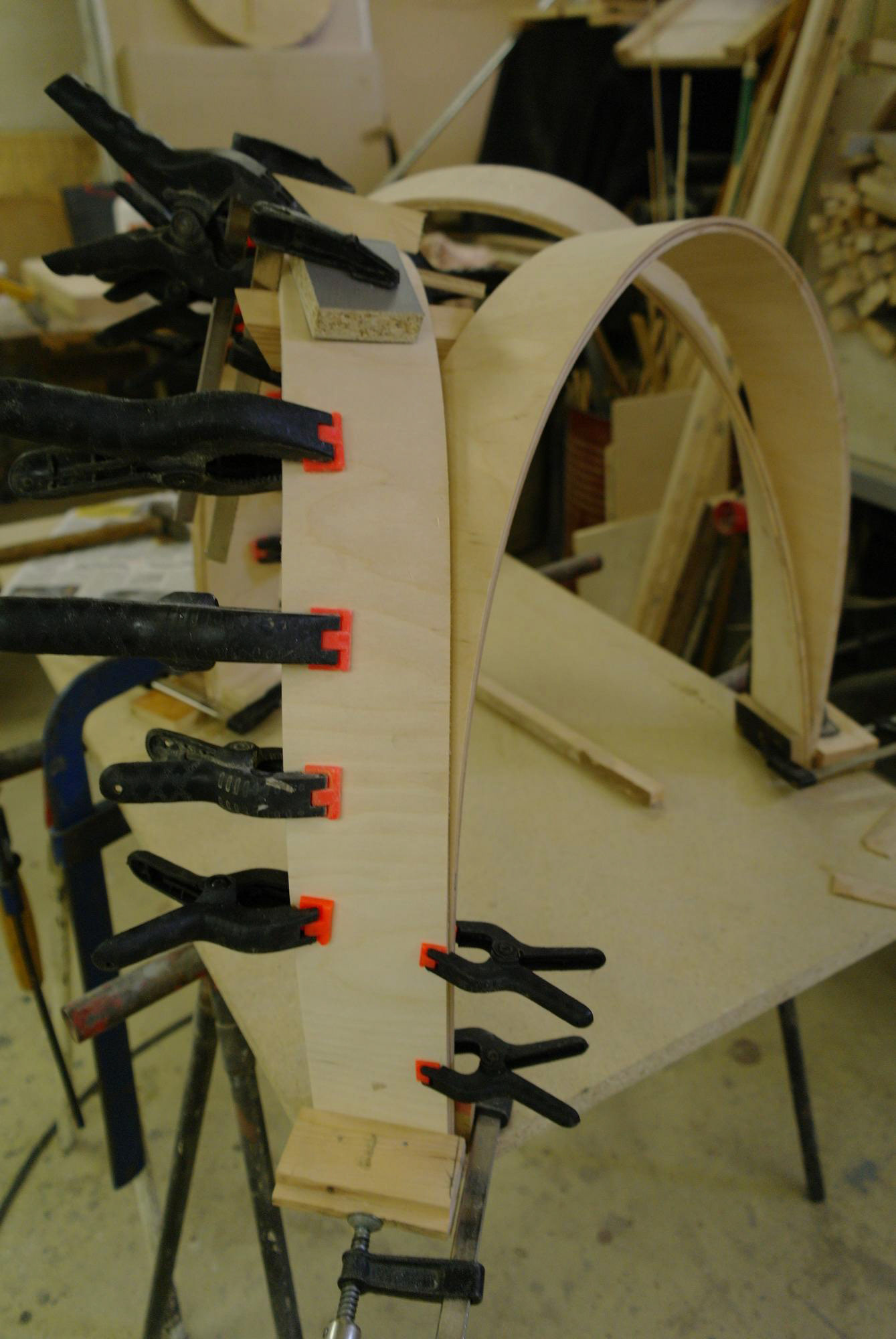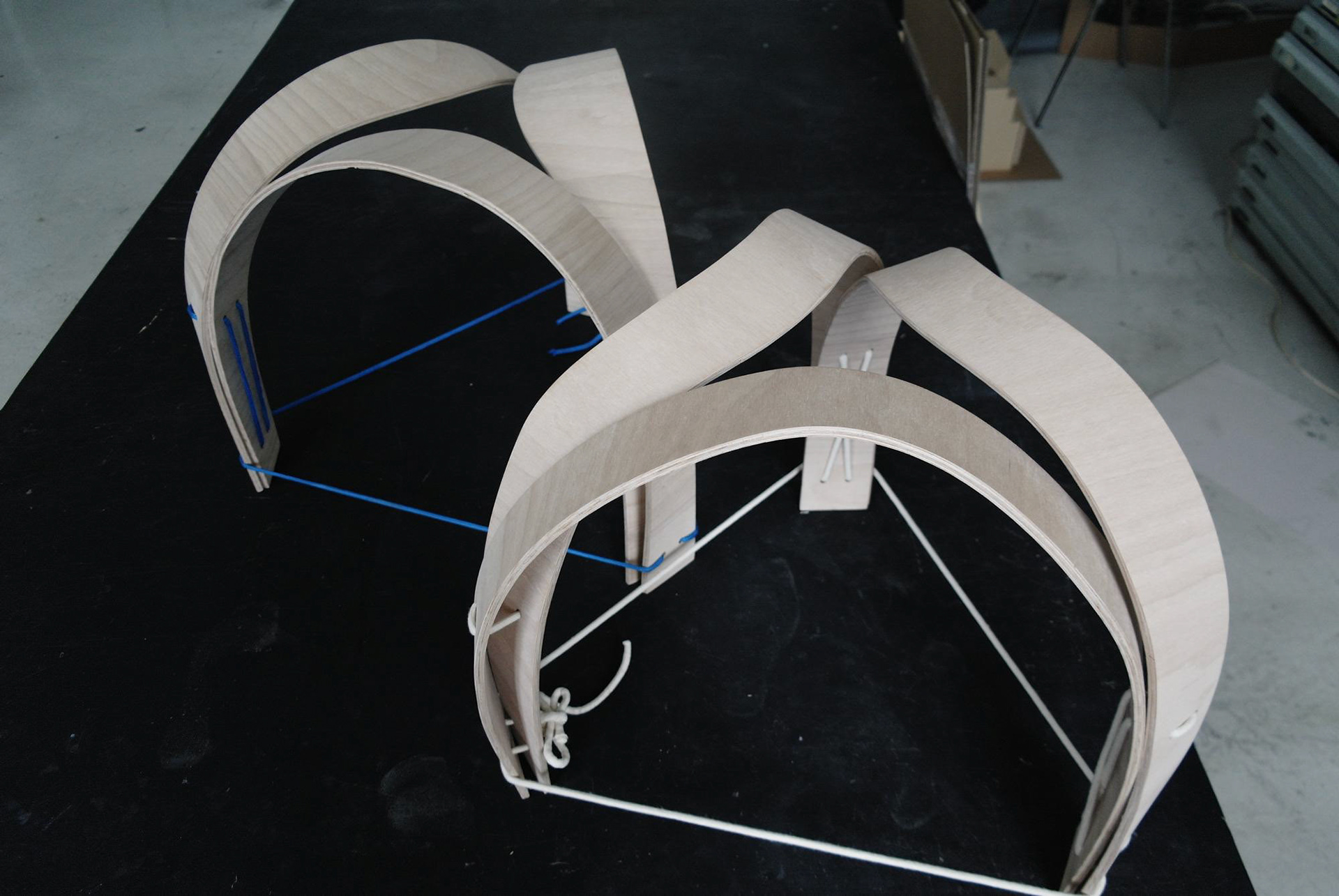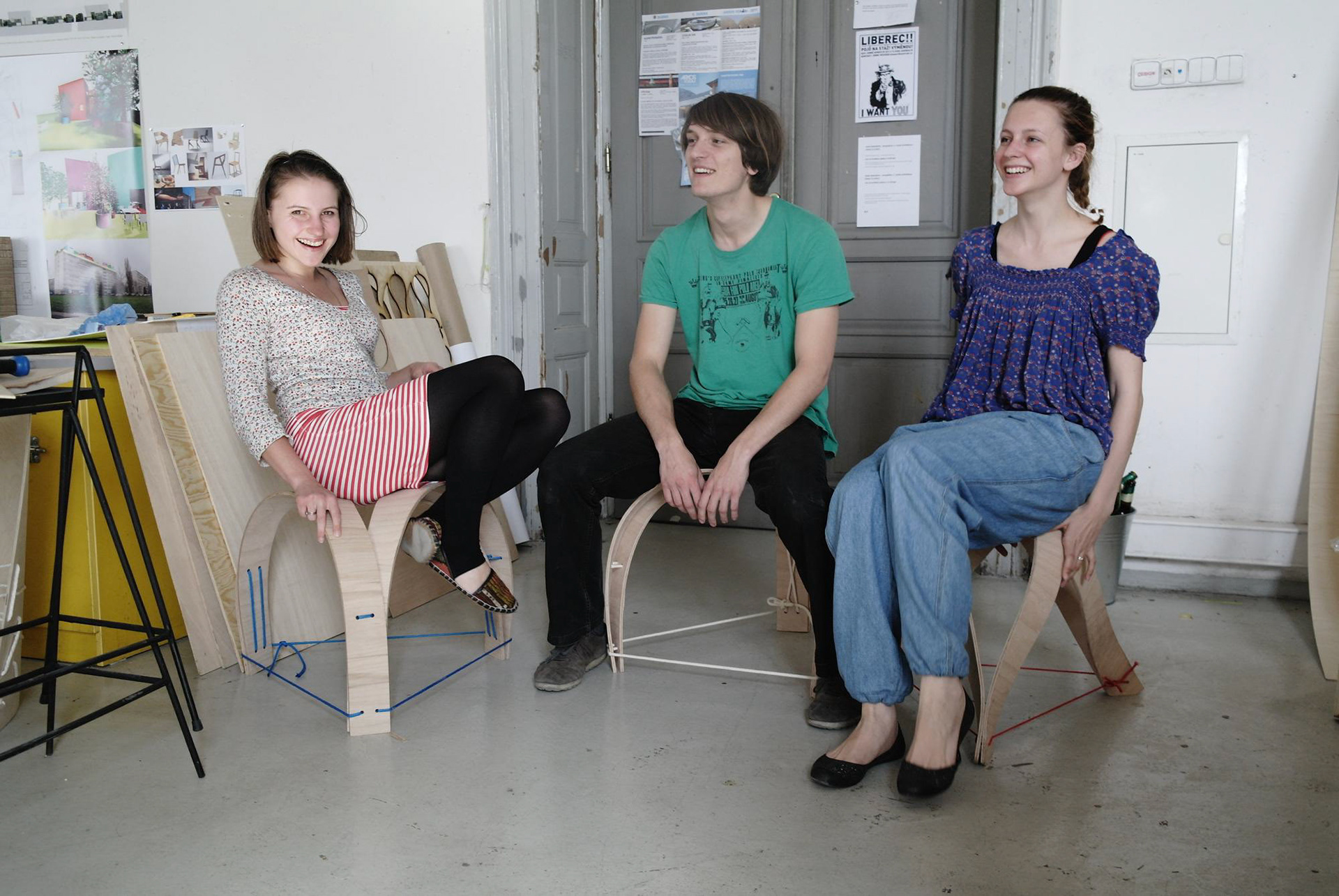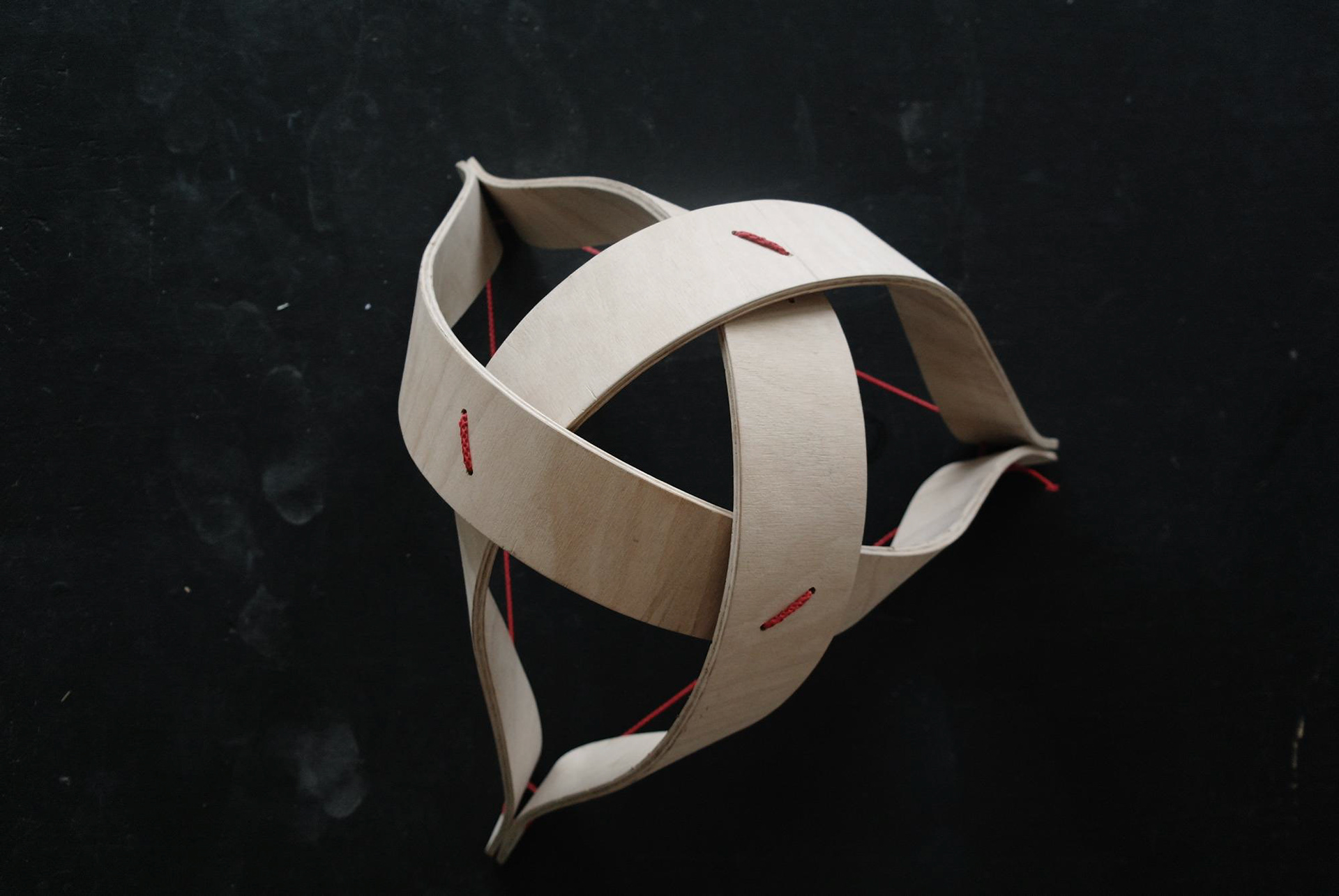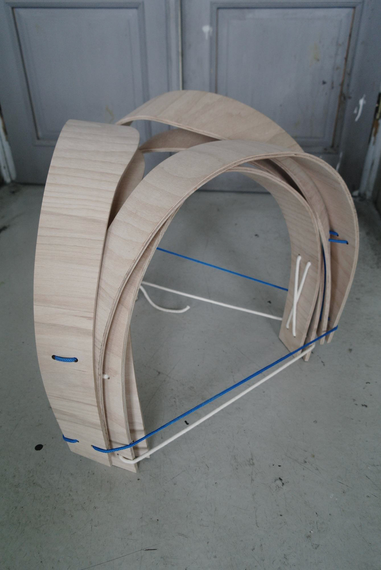 Tři lamely z bukové překližky, ohnuté, propletené a svázané lanem. Jednoduché gesto, vlastnoruční výroba. Přijďte posedět do atelieru.